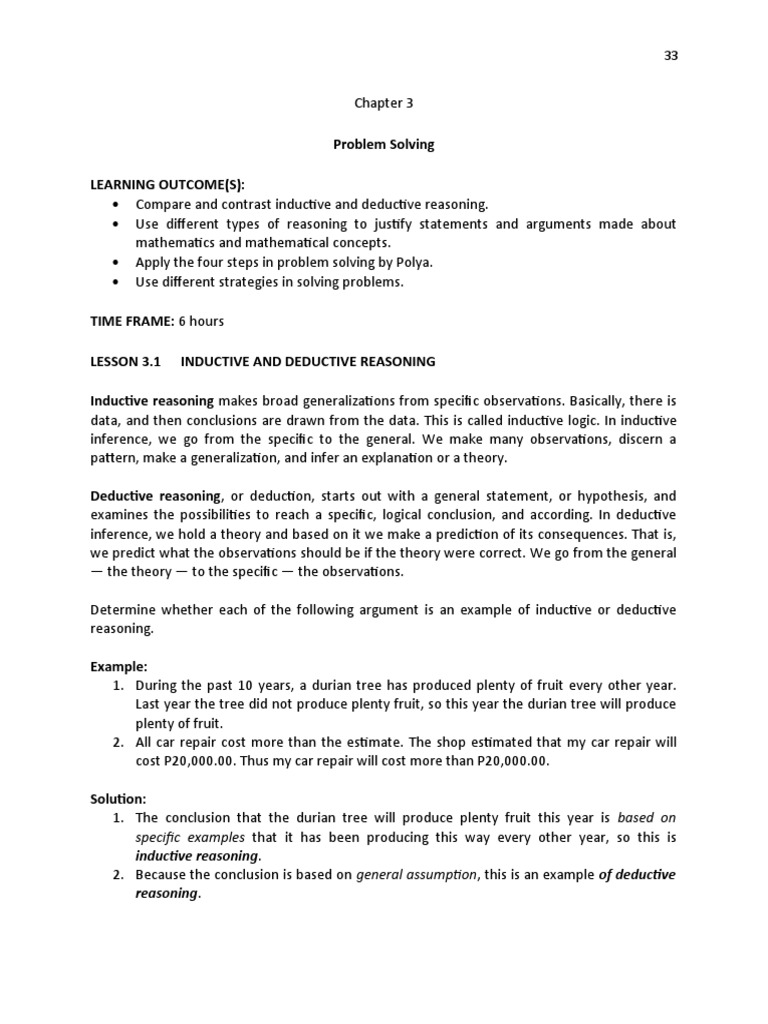 PDF 1.1 Solving Problems by Inductive Reasoning - Crossroads Academy Deductive Reasoning Deductive reasoning is characterized by applying general principles to specific examples. The Moscow papyrus, which dates back to about 1850 B.C., provides an example of inductive reasoning by the early Egyptian mathematicians. Problem 14 in the document reads: You are given a truncated pyramid of 6 for the vertical height ... Quiz & Worksheet - Inductive & Deductive Reasoning Differences - Study.com Using this worksheet and quiz on inductive and deductive reasoning differences, you will learn to identify which of those methods of propositional logic is being used during a logical argument....